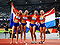 "(L-R) Gold medalists Femke Bol, Eveline Saalberg, Lieke Klaver, and Cathelijn Peeters of Team Netherlands pose for a photo after the Women's 4x400m Relay Final during day nine of the World Athletics C"